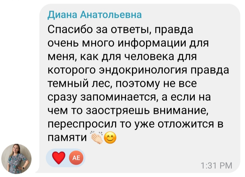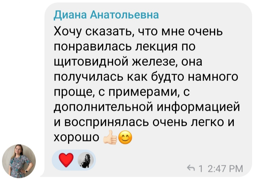 Большое спасибо за структурированную информацию без воды и простым языком. Поняла что эндокринология это не страшно, а домашние задания, эфиры и чат прекрасная возможность закрепить знания!