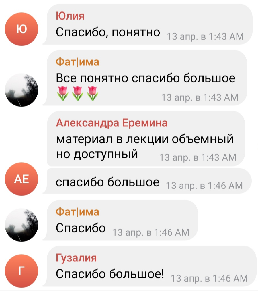 Спасибо большое Аделине за желание максимально разжевать и объяснить тему! Спасибо команде за очень удобное оформление и разделение лекций и домашних заданий!